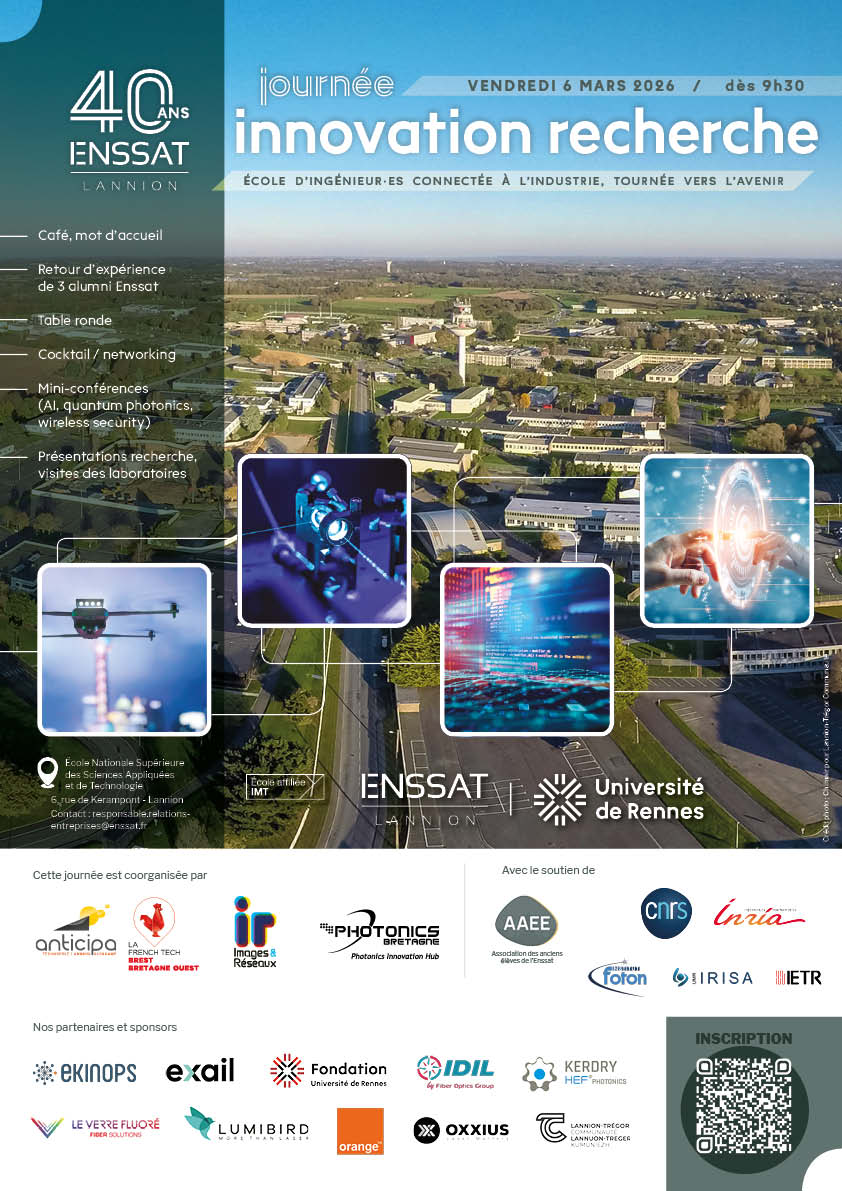 Vendredi 6 mars 2026, dès 9h30 - à l’Enssat, LannionDans le cadre des 40 ans de l’Enssat, « l'École d’ingénieur·es connectée à l’industrie et tournée vers l’avenir » s'associe avec la technopole Anticipa, le pôle Images & Réseaux, Photonics Bretagne et l'association des anciens élèves de l’Enssat (AAEE) pour vous convier à une journée thématique dédiée à la découverte et aux échanges sur les domaines scientifiques de l'école.